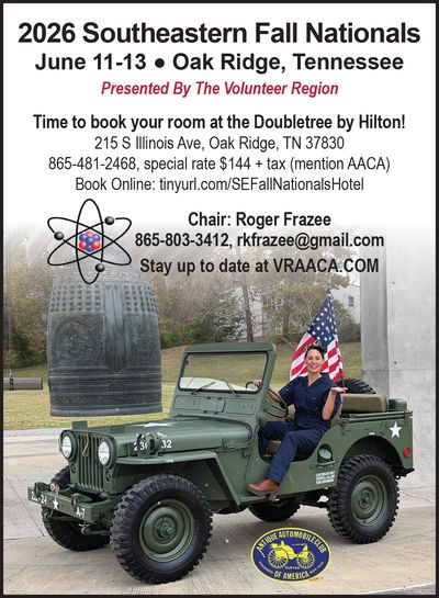 The Southeastern Fall Nationals will be held June 11-13, 2026 in historic Oak Ridge. TN. The Host hotel for the meet is Doubletree by Hilton. A special rate of $144 is available for AACA members during the event. For more information and to book a room go to https://www.hilton.com/en/attend-my-event/orkdtdt-sfn-e8597874-9862-4970-a3f3-b21969d5f6df/.